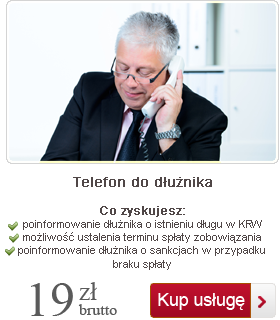Koszt usługi wynosi 19 zł brutto. Jeżeli windykujesz telefonicznie więcej niż 1 dłużnika zamów Pakiet Usług KRW dostosowany do Twoich potrzeb i oszczędzaj na windykacji.
